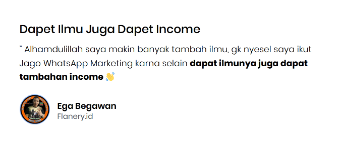 Mungkin awalnya Anda akan berpikir investasi 299 ribu masih terlalu mahal sampai pada akhirnya Anda mulai bayangkan betapa besar dampak yang akan Anda rasakan setelah Belajar Ilmu Jago Whatsapp Marketing.